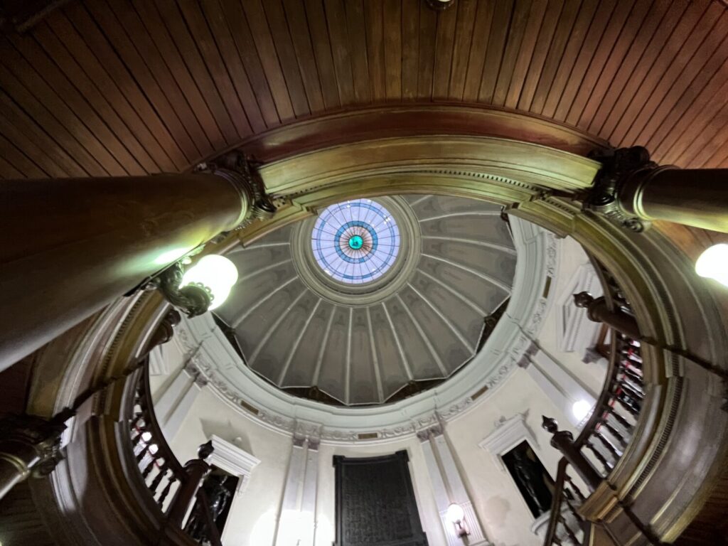 次に驚くのが中央ホールと大階段です。教会のような吹き抜け空間にステンドグラスのドーム天井。ステンドグラスから光が入り込んだらさぞかし幻想的な風景が楽しめるのではないでしょうか。この辺りは写真撮影OKなので、インスタ映えする写真が撮れそうです。