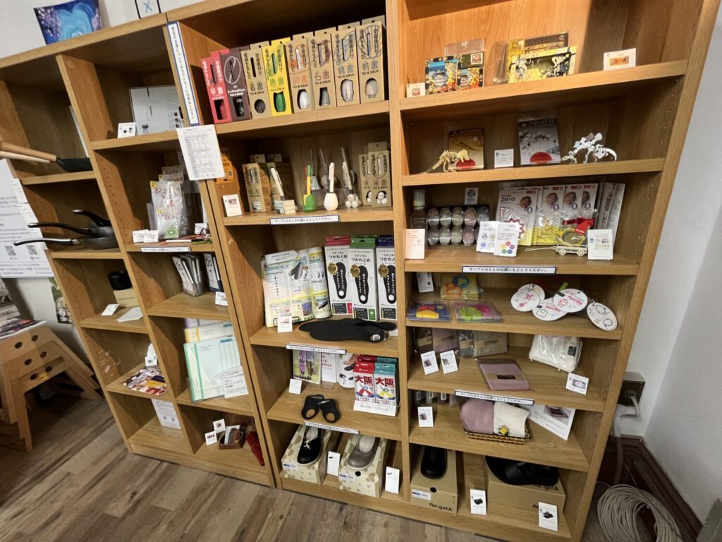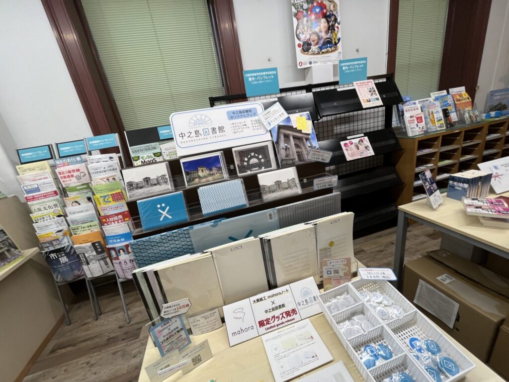 大阪府立中之島図書館のライブラリーショップには中之島図書館のオリジナルグッズも販売しています。ポストカードはもちろん、ノートや缶バッチなどもあります。大阪万博のミャクミャク君グッズも売っていました。それどころか、おもちゃや靴やランドセルまで。これはもうただの図書館ではないですよね?