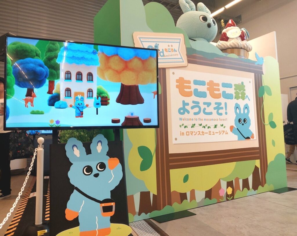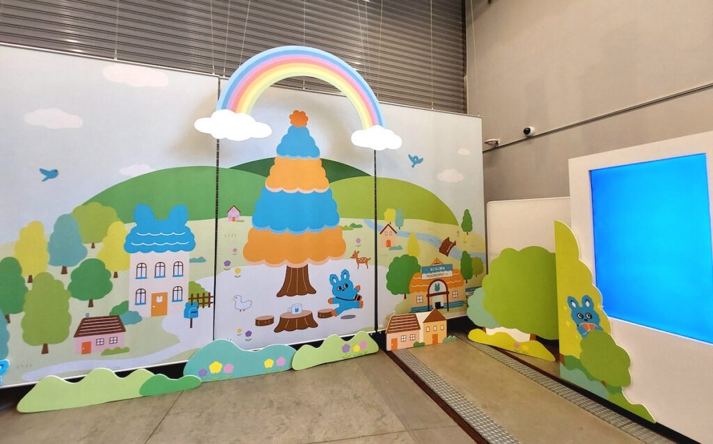「もこもこ森へようこそ!」は、イラストパネルやタペストリーを使って「もころん」の世界観を再現したコーナーです。「もころん」のイメージカラーの、水色とオレンジ色の葉を茂らせた不思議な木や、うさぎの耳を付けた「もころんの家」も登場。