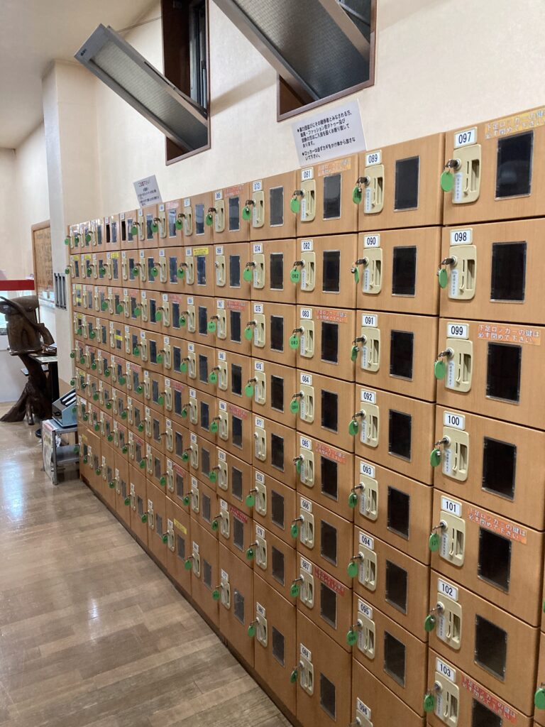 中に入ると、靴を入れるロッカーが並んでいます。100円を入れて鍵をかける方式です。ちなみに、入れた100円は返ってくるので安心してください。
