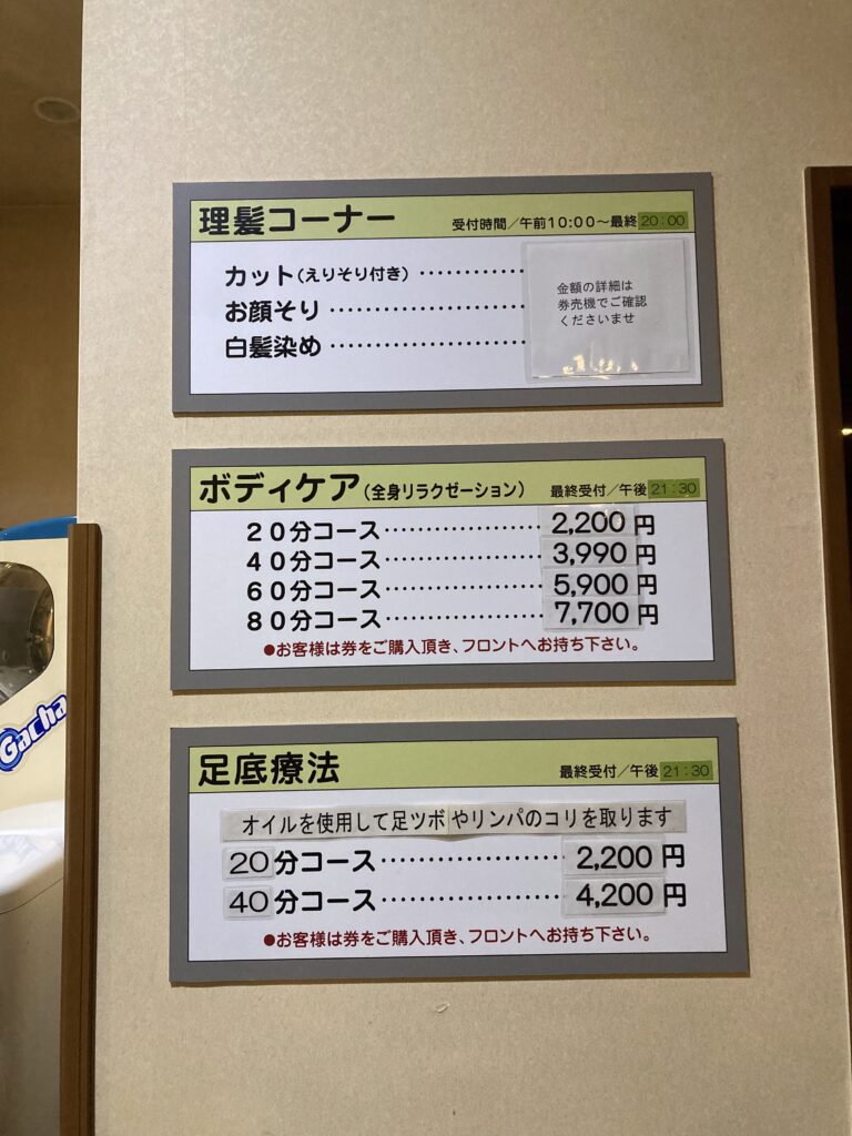 理髪店やリラクゼーションなどもあるようで、予想以上に多くのことができるようです。さすがスーパー銭湯といった感じですね。