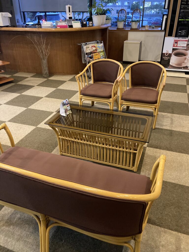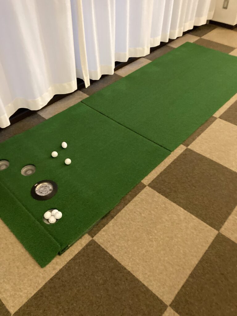 中に入ったら、受付をして席番号を選び、打席に向かいます。フロントの向かいには、パター練習マットや休憩スペースがありました。