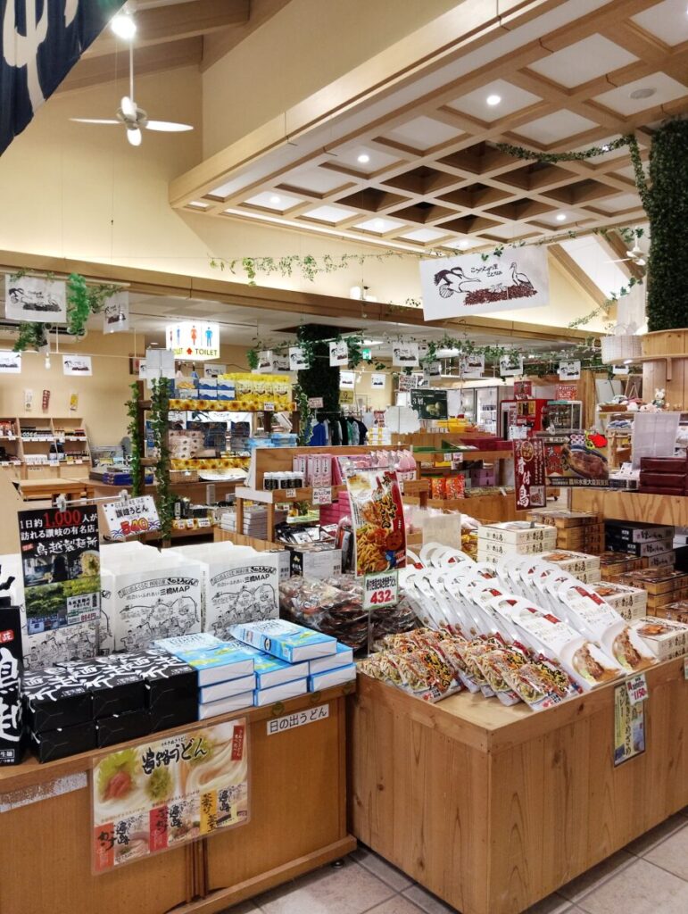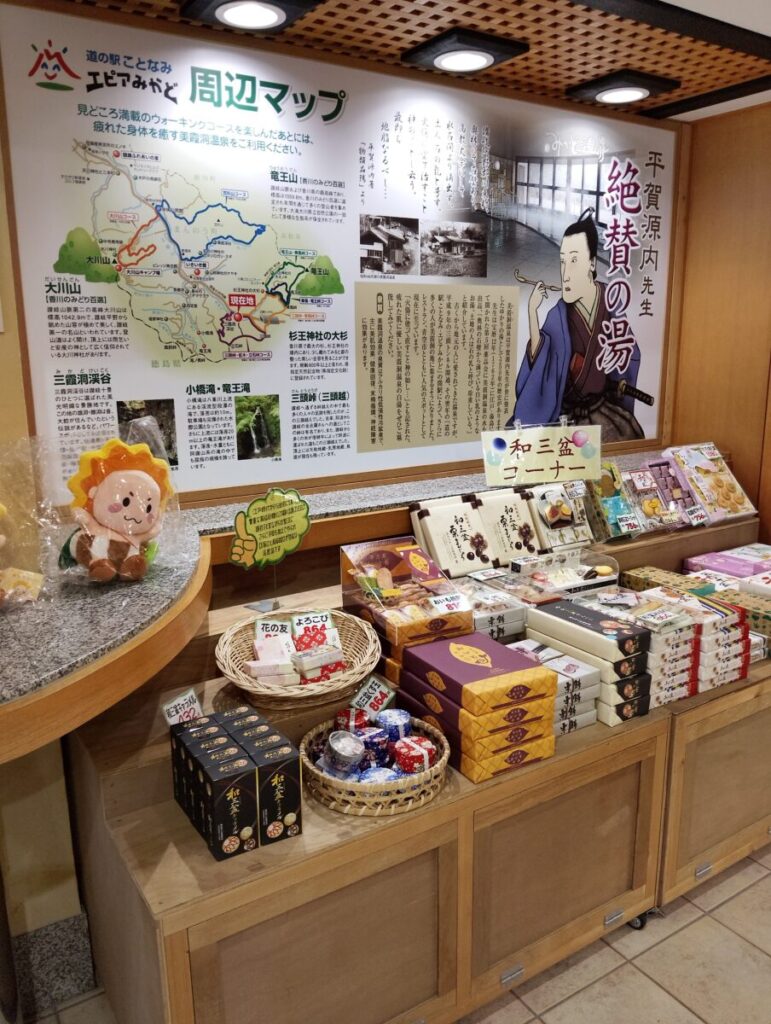 周辺の観光情報を記したボード、特産品の和三盆を使ったお菓子、讃岐うどんや骨付鳥といった香川を代表するお土産が置かれています。