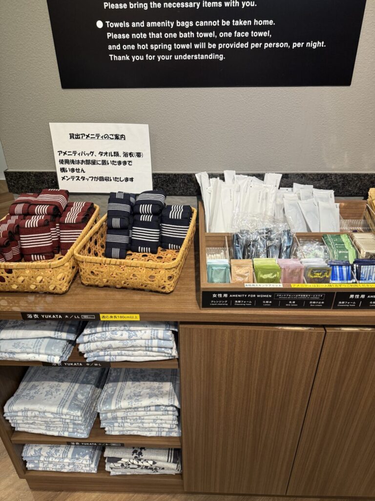 アメニティとしても、ハンドソープ・ボディソープ・シャンプー・コンディショナーが標準であり、さらに「アメニティバイキング」として1Fでバスタオル・浴衣(S/M/L)・歯ブラシセットなどを自由に取れる方式になっているのが印象的でした。
