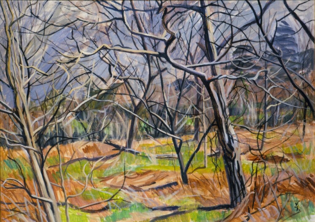 水彩絵具のガッシュとは、不透明水彩のことで、下の色が透けず、本作でも木々の重厚な雰囲気を醸し出しています。
