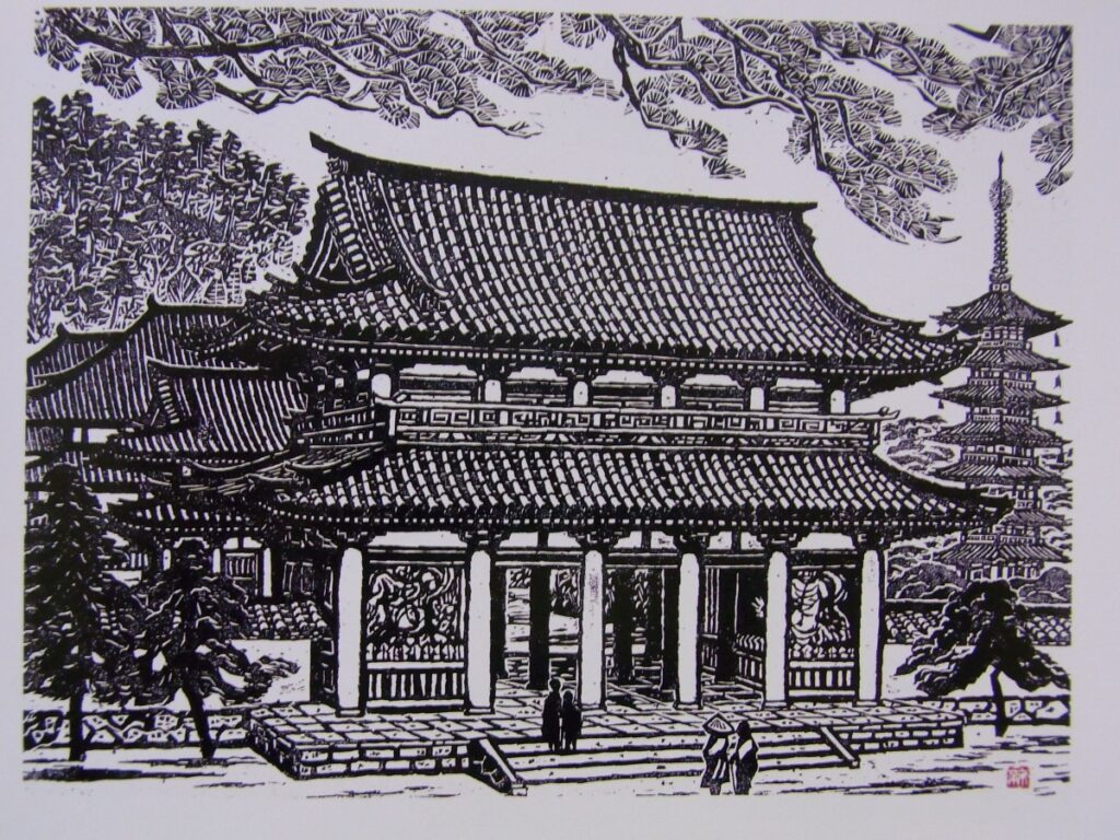 木々は細かく繊細ながらも、建物自体は力強い描写で、堂々たる国分寺の姿を描いています。