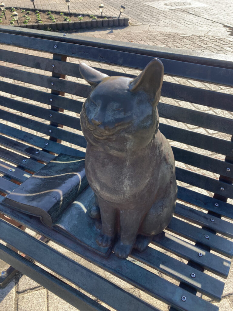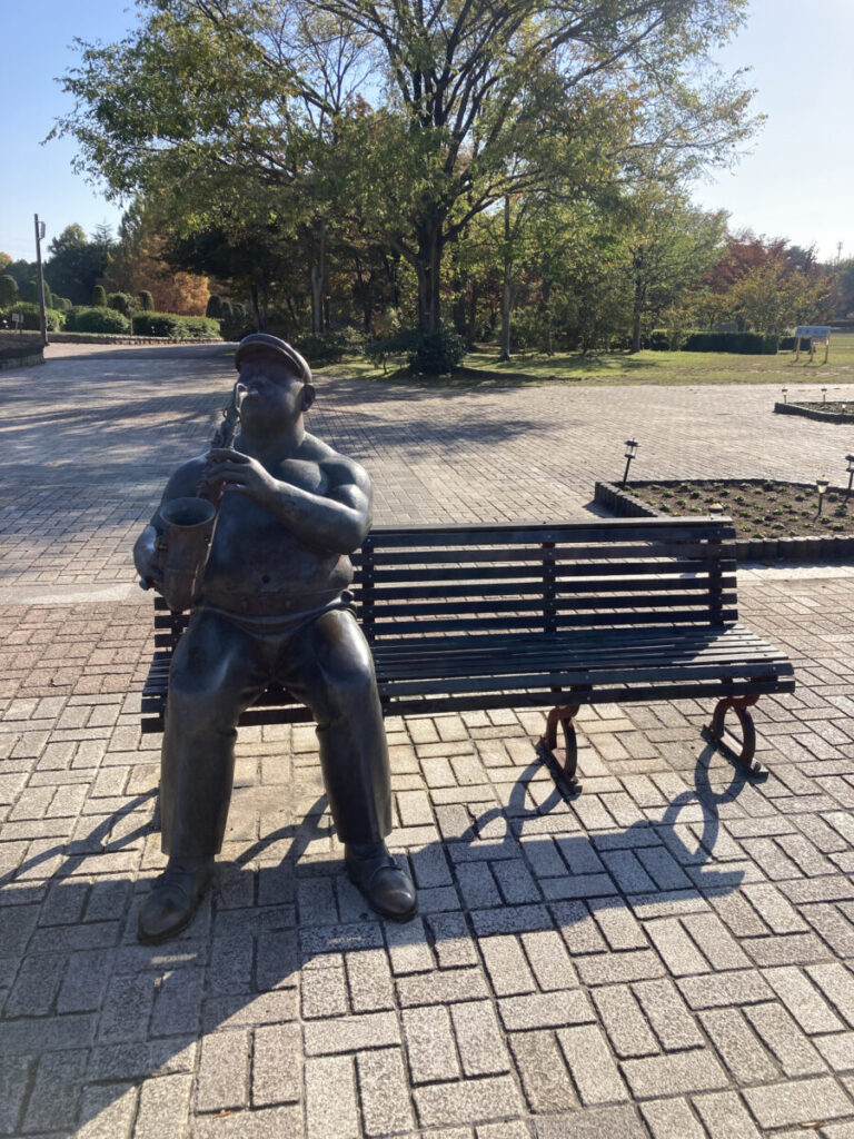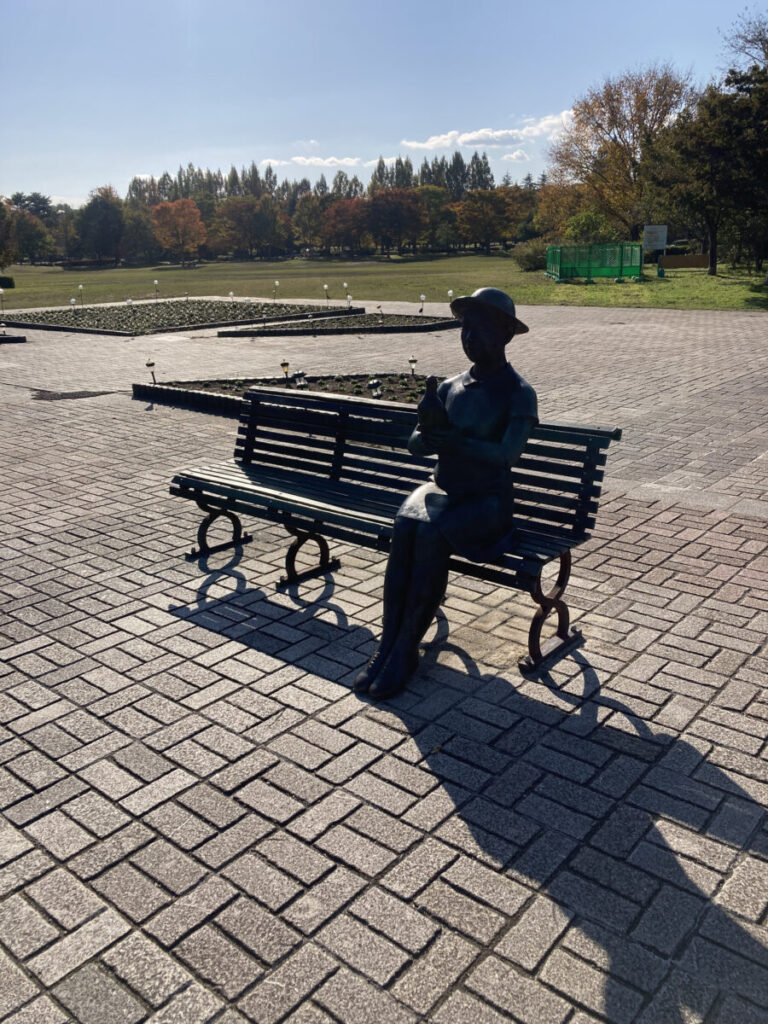 少し進むと、ベンチに銅像が座っていました。一瞬、銅像のふりをした人間かと思って警戒しましたが、普通に銅像でした(笑)。
