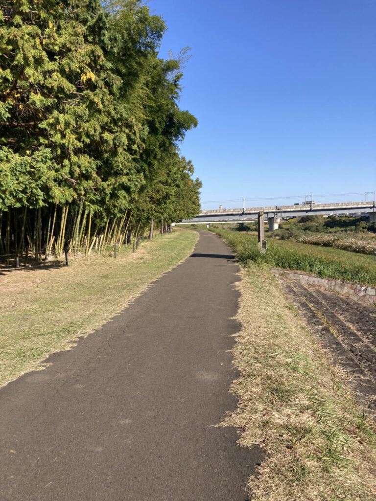 公園の最奥へ行くと、七北田川沿いに出ました。ザ・河川敷の道という感じで、サイクリングやランニングによさそうです。私が行ったときは、川沿いでバーベキューを楽しんでいる人たちがいました。