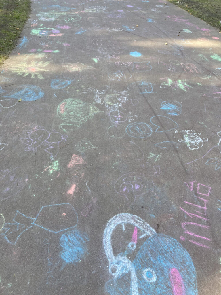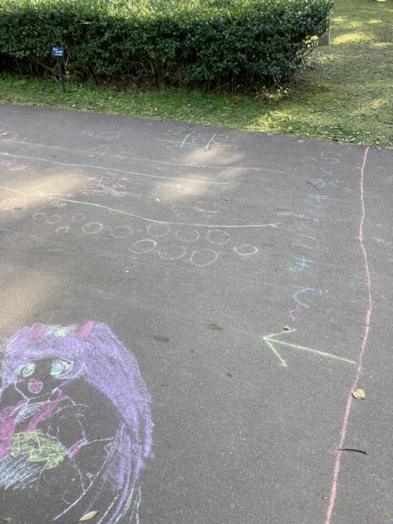 ここの周りの道路は落書きができるらしく、かわいらしい絵がたくさんありました。