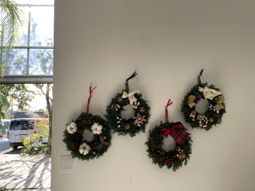 アトリエには、クリスマスリースやしめ縄、スワッグが丁寧にしつらえてありました。