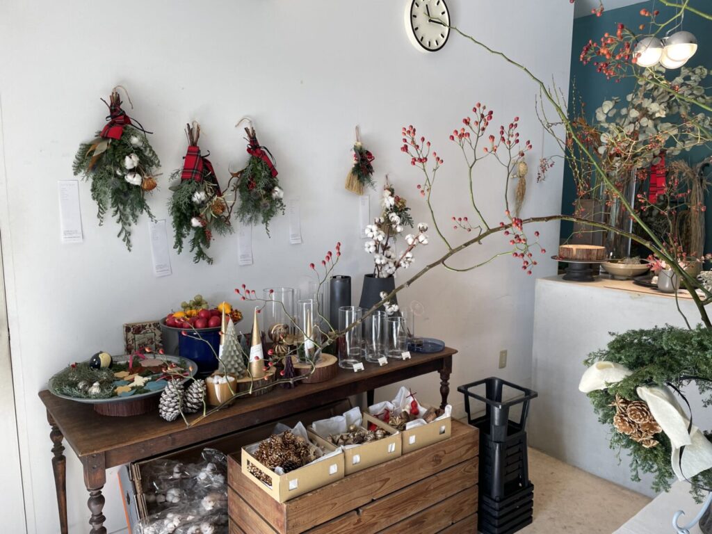 店内には、枝ものやリース、スワッグなど、季節の美しさを感じるアイテムが並び、どれも丁寧に選び抜かれたセンスの良さが感じられます。