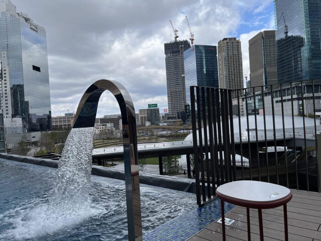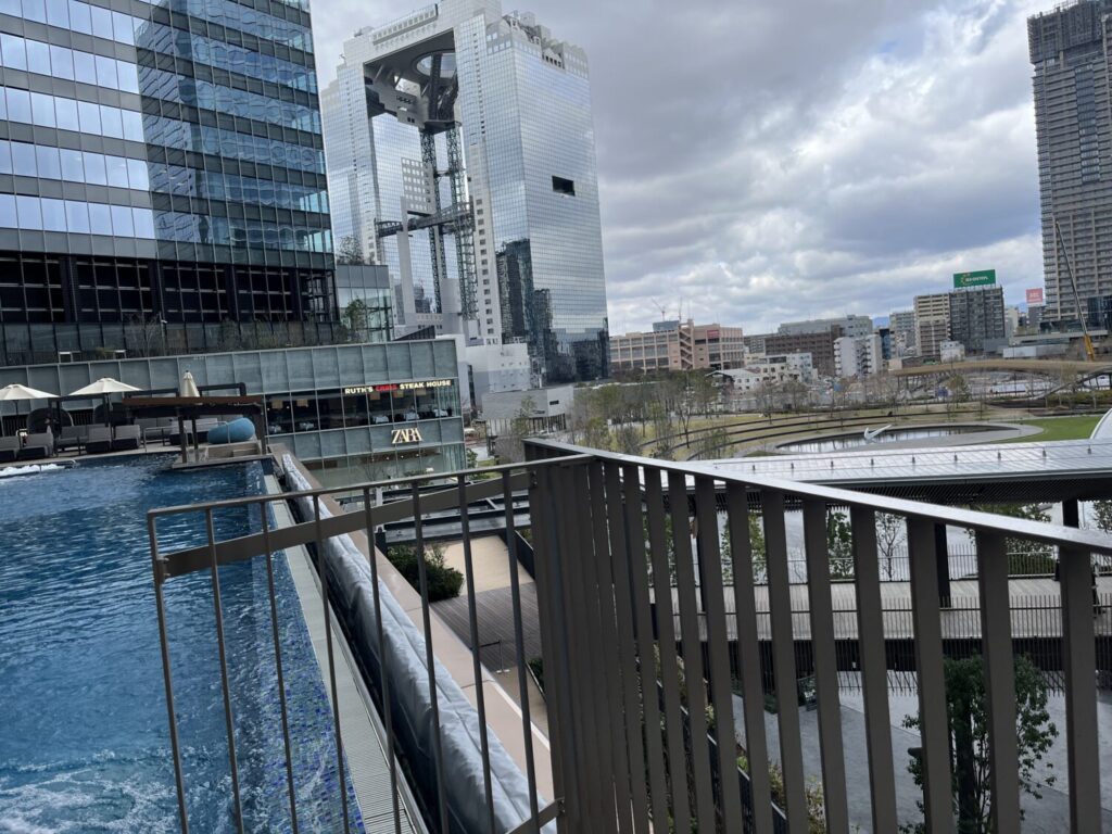 こちらが屋外温水インフィニティプールです。見てください。ここからの景色。周りに見えるのはまさに大阪の摩天楼。新しいうめきたグラングリーンエリアが見渡せます。そして、シンガポールのマリーナベイ・サンズのように、水面ぎりぎりの際のあたりまで水があり、まるで空中に浮いているように見えて、まさに天空のプールです。