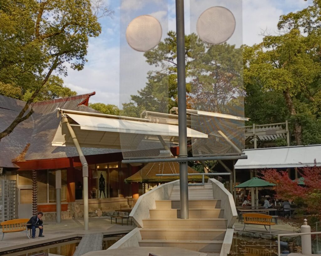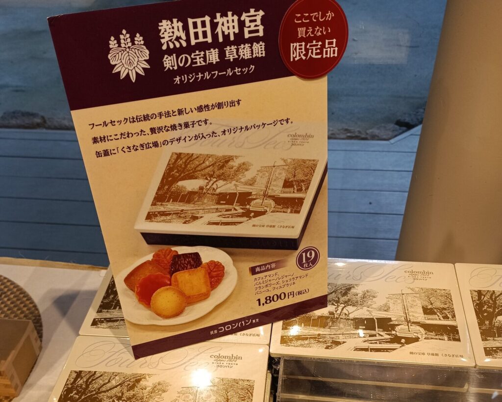 お参りで少し歩き疲れたら、こちらの広場で休憩しましょう。くさなぎ広場は2021年に改装されたばかりで、参拝者が落ち着けるくつろぎの空間。南神池には「熱田湊※1」をイメージした船があり、子供たちも楽しく遊べるスポット。広場には売店も併設しており、熱田神宮所蔵の刀剣や宝物をモチーフにした参拝記念の品やここでしか買えない名古屋銘菓などが取り揃えられています。