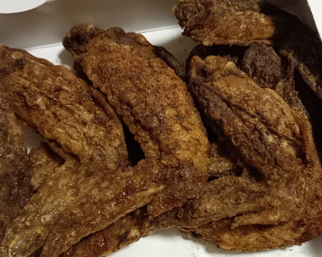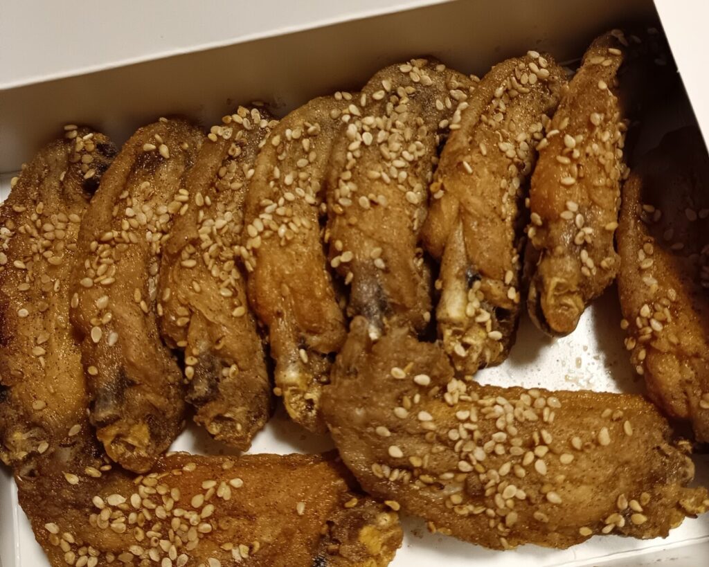 次は「風来坊」元祖手羽先唐揚(1人前5本)680円(税込)です。手羽先発祥の店と言われており、甘辛タレがしっかり絡んだ照りが特徴でゴマが多め。カリっと軽めの食感なので、比較的マイルドでお子様からお年寄りまでみんなが楽しめるお味になっています。