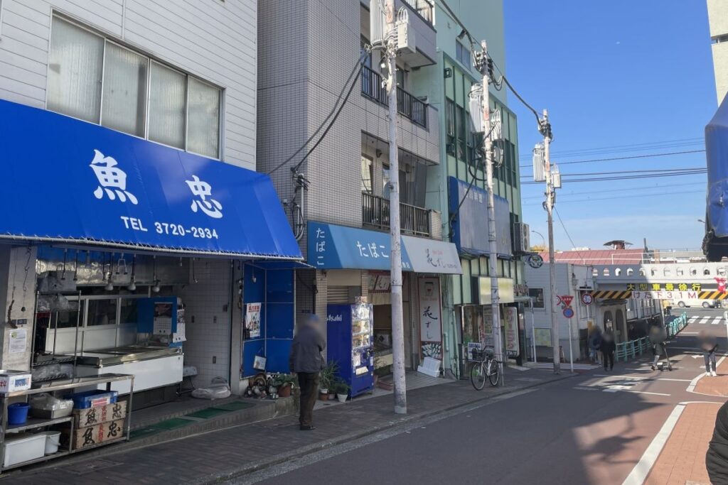 まず目についたのは、青いひさしが眩しい昭和12(1937)年創業の魚屋さん「魚忠(うおちゅう)」である。
