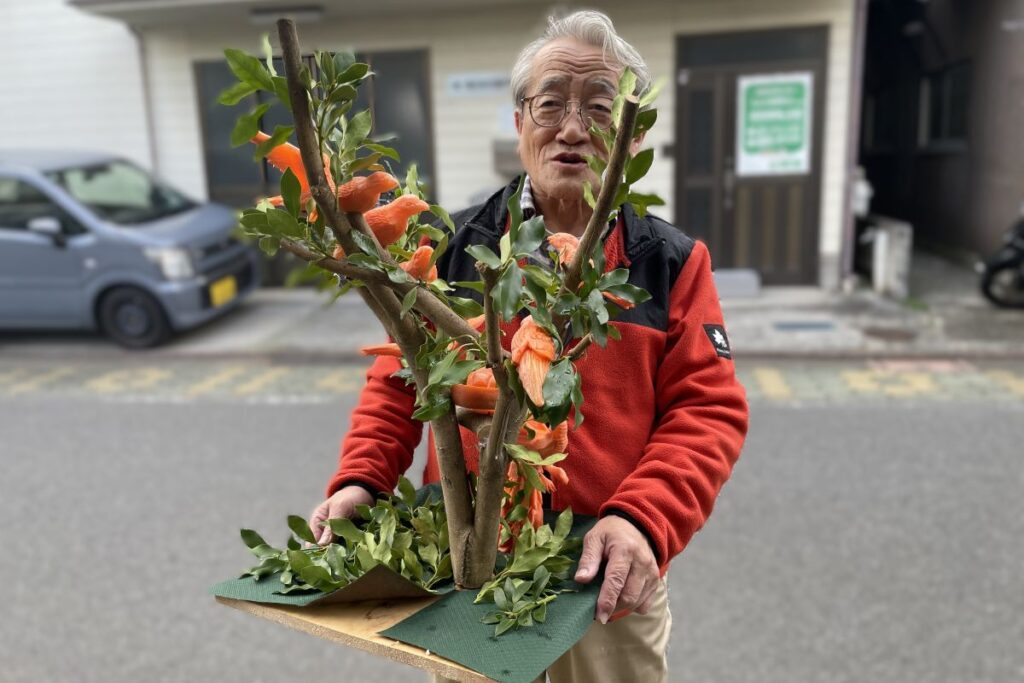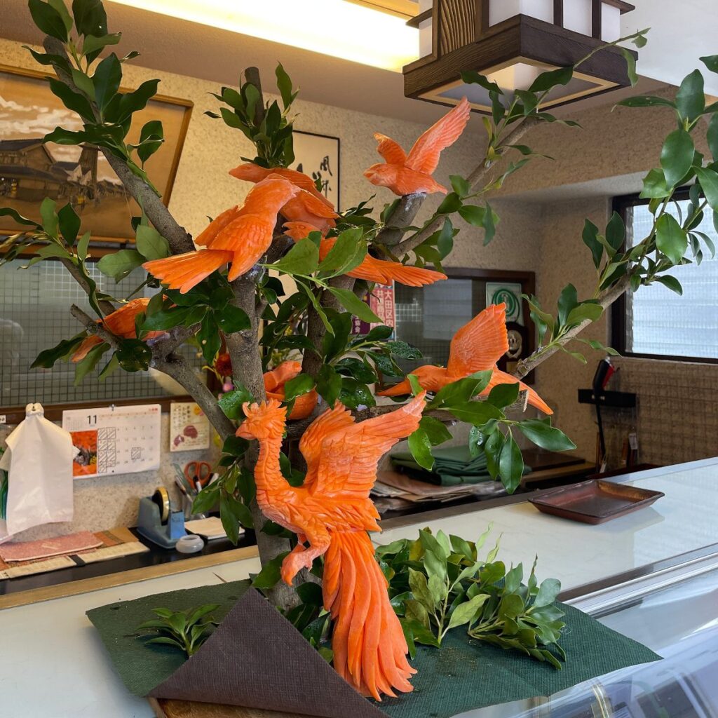 梅屋さんに取材交渉している日、なにやらオレンジ色の彫刻を抱えたお方がふらり立ち寄られた。これ、人参だよ、と教えて下さる、人参って彫るものだったのだ、と驚いていると、先日、氷の彫刻師として初めて「現代の名工」に選ばれた「工房一会」の小野恒夫(おのつねお)さんだった。