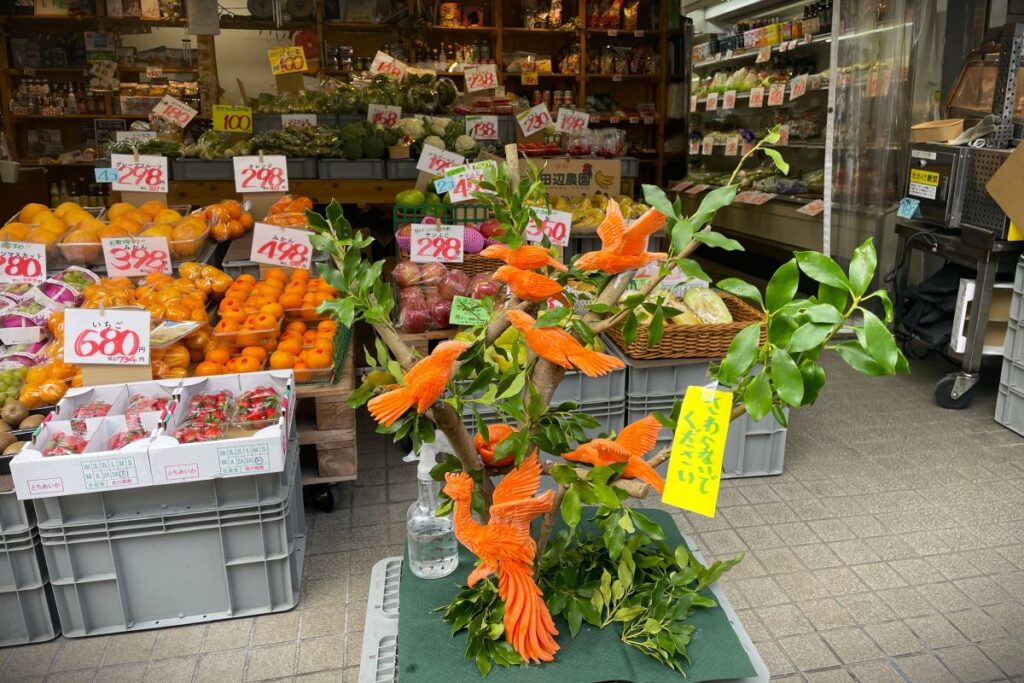 数10分後に立ち寄ると、くだんの人参の彫りモノが八百屋の店先でオレンジ色に輝いていた。