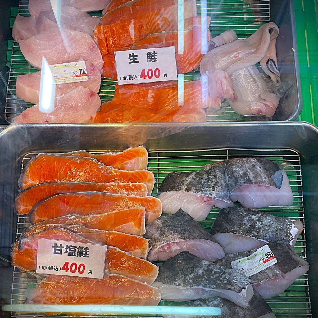 取材当日、ショーケースを覗き込むと、かじきまぐろ、しゃけ、たら、海老、絞甲いか、牡蛎、まぐろ、中おち、中トロ、赤貝、あじ酢、などが並び、ひらめの刺身パックに中トロ2切れがついていた。