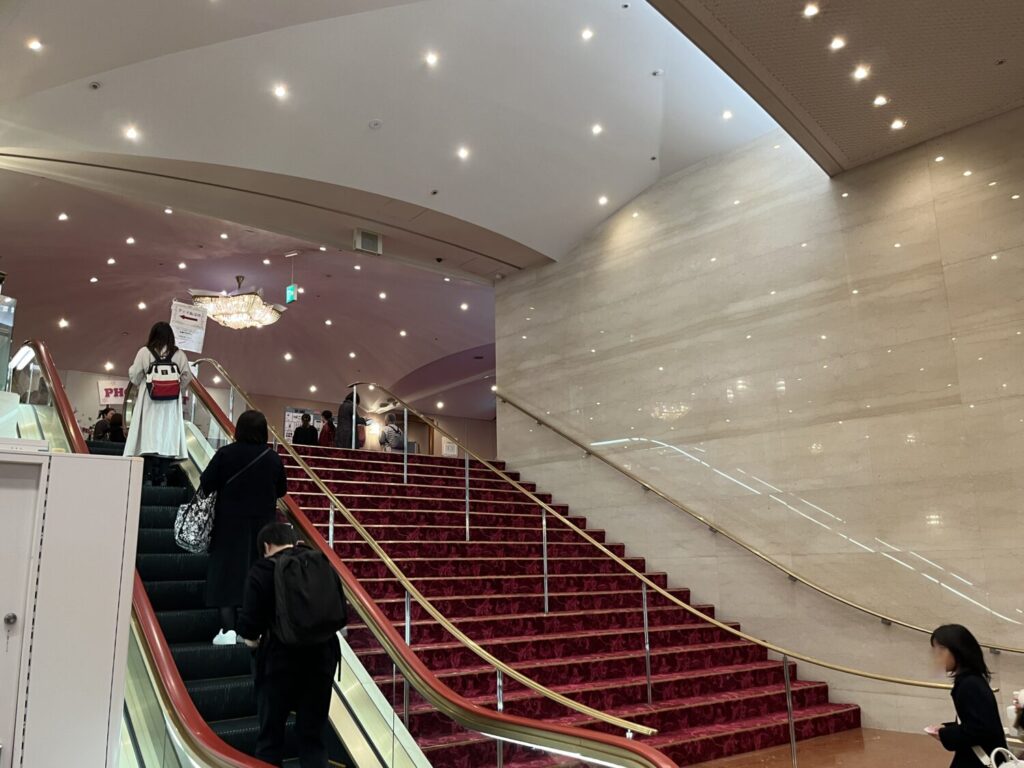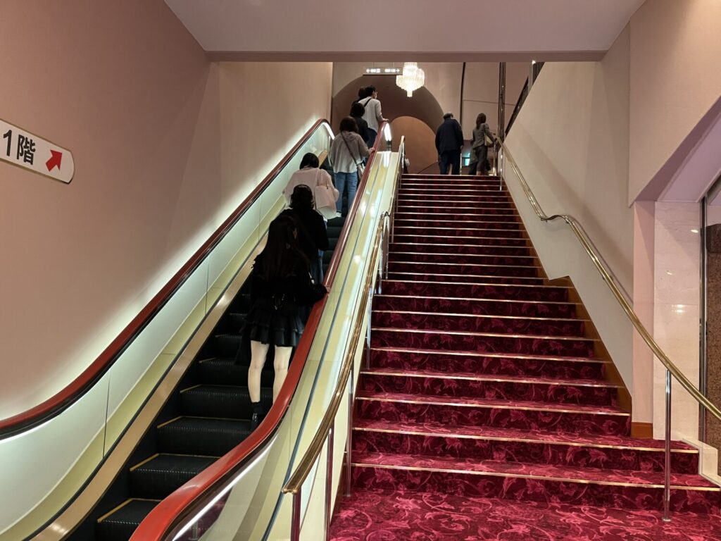 観劇当日。入り口前は人だかりです。みんな並んでポスターと一緒に写真を撮っていました。館内に入るとエレベーターがあり、スタッフの誘導に従って上に上がっていきます。館内に入るとエスカレーターがあり、スタッフの誘導に従って上に上がっていきます。今回は3階だったのですが、かなり何度もエスカレーターを上がりました。