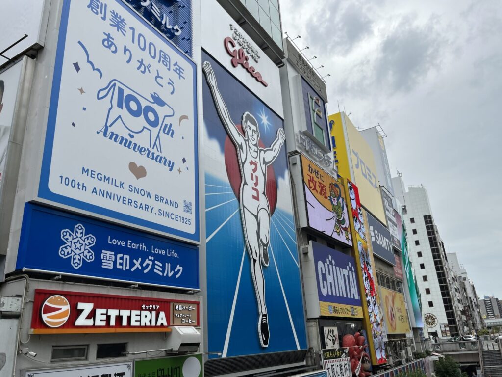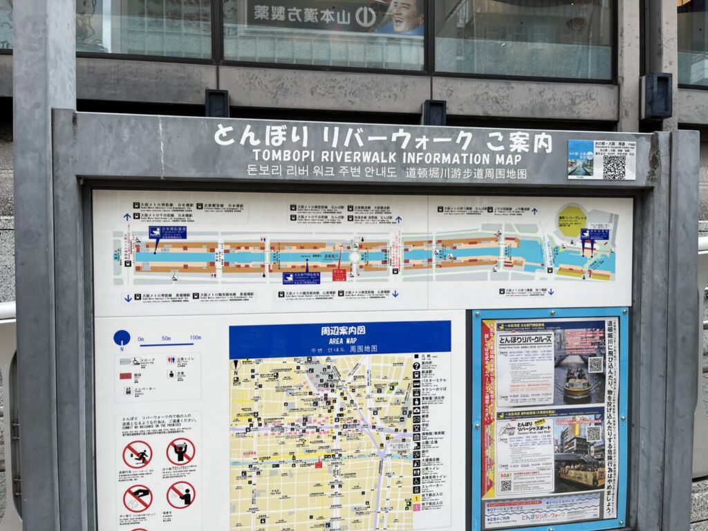 とんぼりリバーウォークからもグリコの看板が見えます。普通は戎橋からグリコの看板を見る人が多いのですが、とんぼりリバーウォークからだと、人込みを避けて正面からグリコの看板を写真に収めることができますよ。
