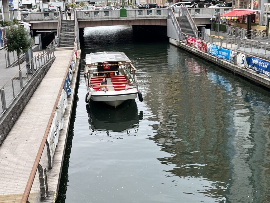 そして、こちらがその道頓堀川。こちらでは船が遊覧していますが、これはとんぼりリバークルーズです。道頓堀川から見上げた街はまるでテーマパーク。そんな風景を約20分の遊覧で楽しめます。