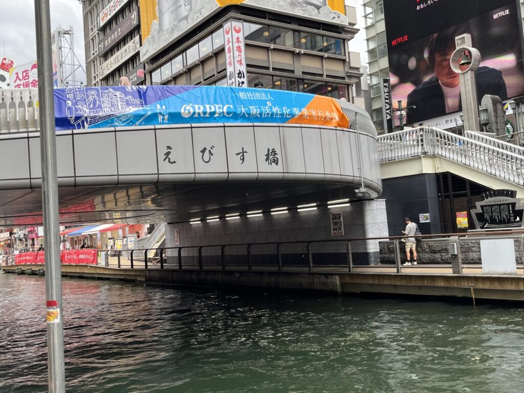 こちらが戎橋です。戎橋は「ひっかけ橋」とも言って、昔はナンパの聖地だったとか。今はインバウンド客が多くて、ナンパどころの騒ぎではありません。