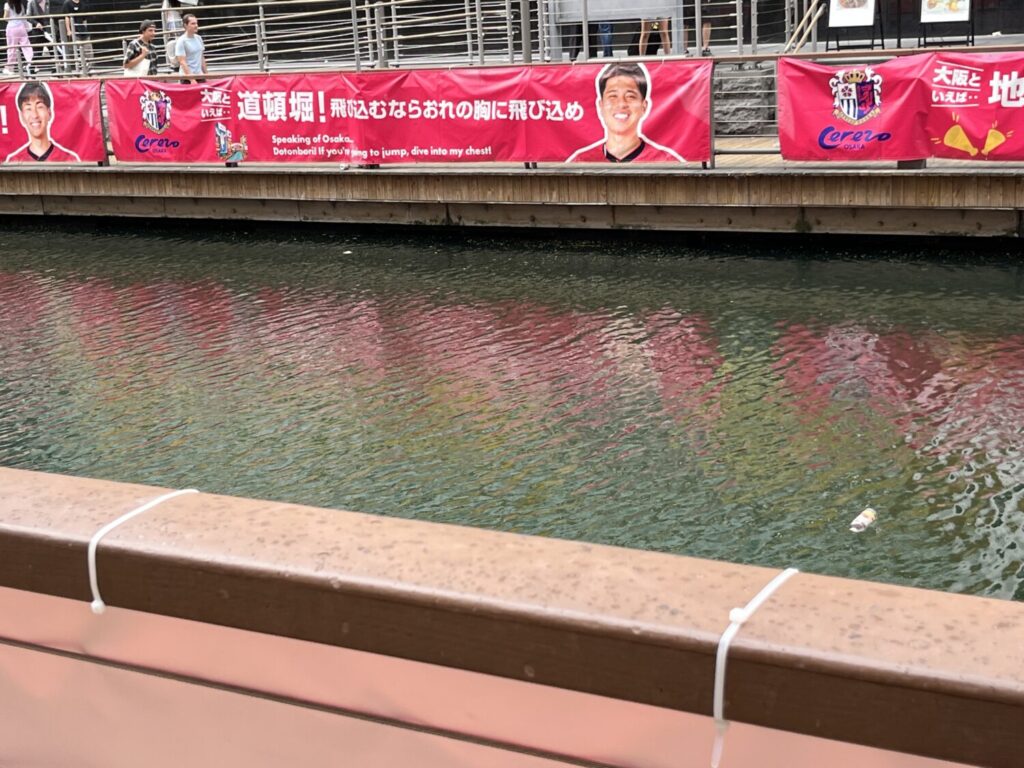 特に、阪神タイガースが優勝したときはこの辺りに喜び勇んだ人々がなぜか集まってきます。大阪府警も厳戒態勢に入り、たくさんの警官が配置されるとか。飛び込み行為をさせないようにがんばっているんですね。