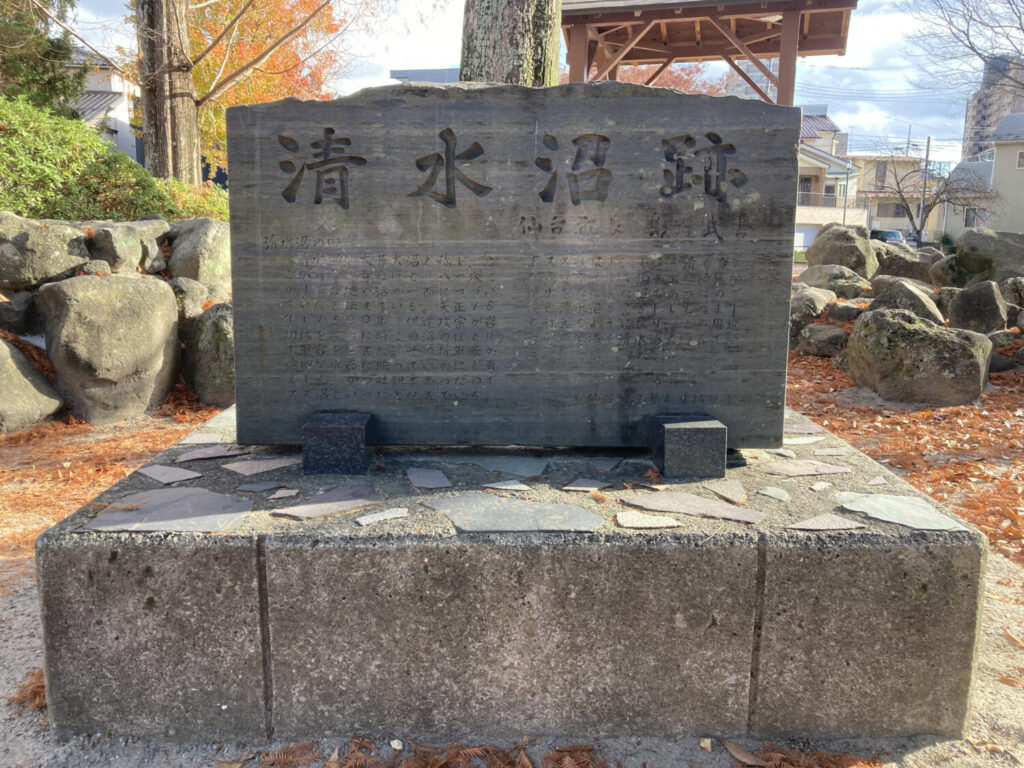 石碑には「清水沼」の名前の由来も書いてありました。石碑に書かれていた情報によると、1590年(天正18年)に伊達政宗がここを訪れ、岩切城を攻めるために軍容を整えたようです。