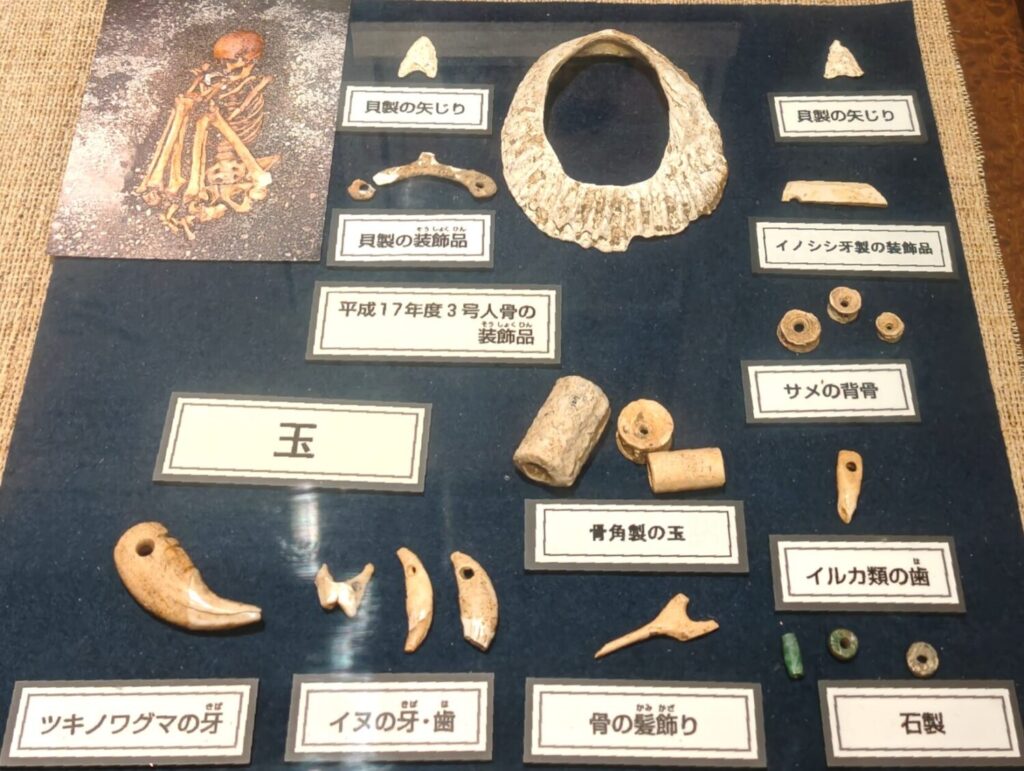 人骨と共に発掘されたのが、貝や動物の骨などで作られた副葬品です。