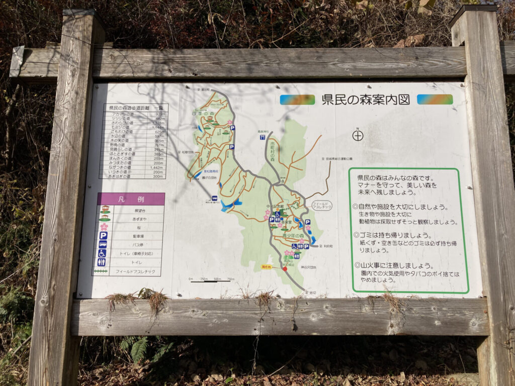また、入口には「宮城県県民の森」の全体マップがあります。「岩切城跡」は、園内マップで見ると南の方にあります。