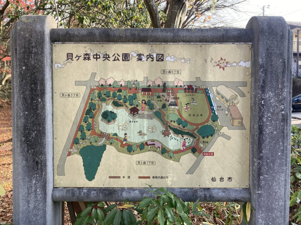 もう少し奥へ行くと、「貝ケ森中央公園」の全体マップがありました。ぐるっと一周回ってきたんですね。