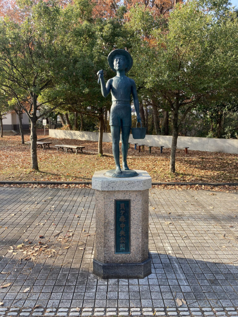 バスを降りると、まずは「貝ケ森中央公園」の文字と一緒に銅像がありました。少年が何かをしている瞬間のようですね。