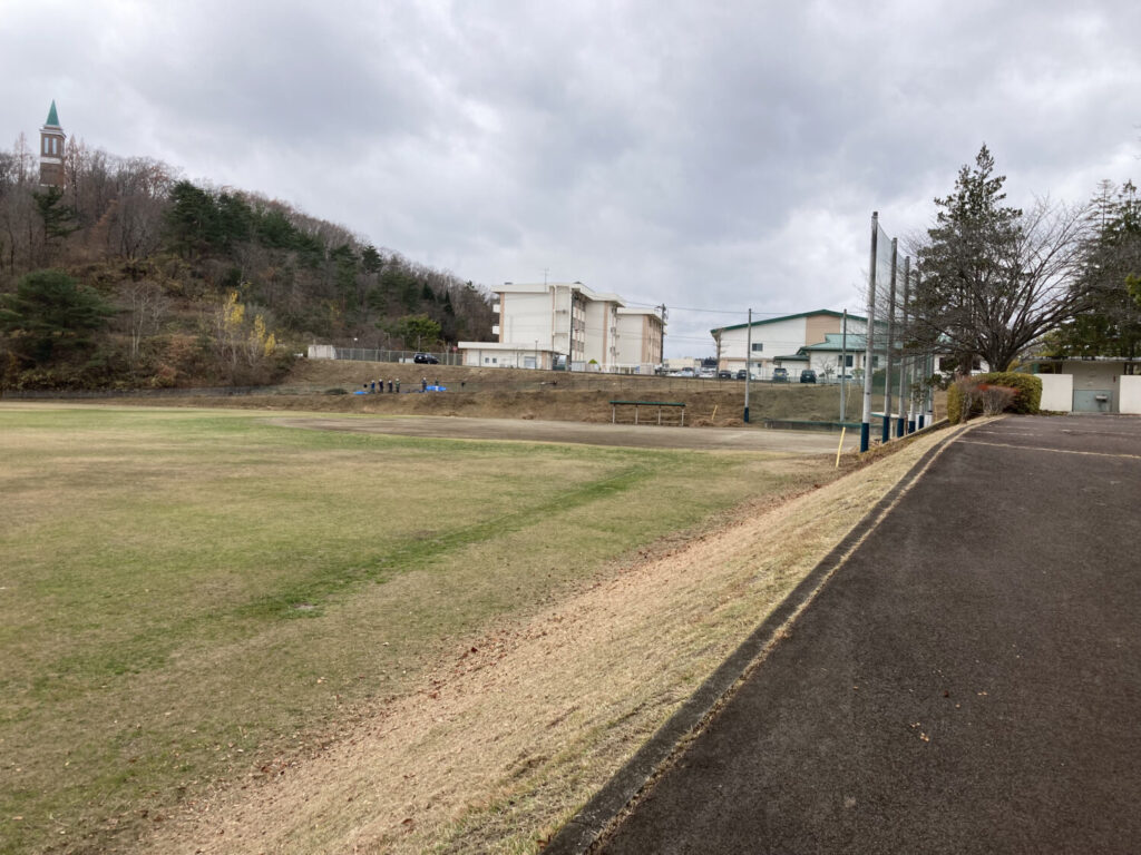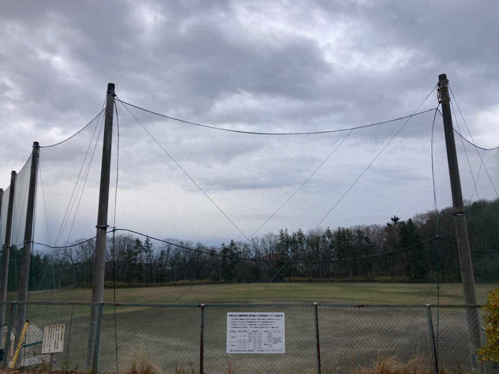 野球場が一段低くなっているので、観戦はしやすそうですね。ちなみに、写真の左奥に見えるのが「とんがりタワー」と呼ばれている洋風の給水塔です。寺岡地区のシンボルとして、近隣住民に愛されています。