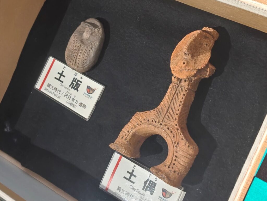 展示室では、「まほろん」のキャラクターのモデルにもなっている土偶(荒小路遺跡出土)に出会えます。ユニークな姿から、全国的にも知られている人気の土偶です。