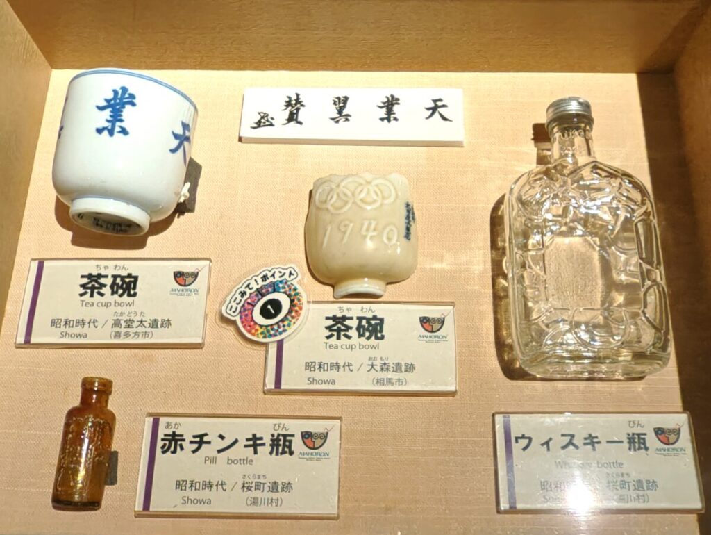 発掘された昭和の遺物も展示されています。先ほどの「ココみてMAP」で紹介されていたのはこの茶碗です。説明によると、1940年に開催予定だったオリンピック(戦争で中止)の茶碗とのこと。知らなかった昭和の一面が見られます。