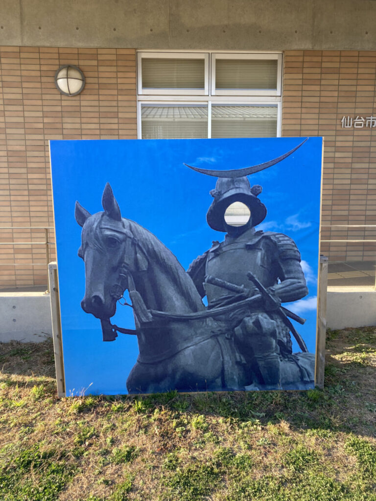 エサやりをしようと管理棟へ向かうと、目の前に記念写真が撮れそうなパネルがありました。伊達政宗像に顔ハメできる仙台感たっぷりの記念写真が撮れますので、ぜひこちらもお見逃しなく!