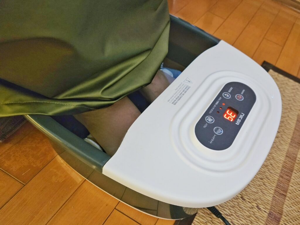 始めの15分間は足湯もセット。深型のマシンなので、ふくらはぎ辺りまでしっかり浸かります。15分も経つと、じんわり温まってきた印象。時間がきたら足湯を外し、今度はよもぎ蒸しの蒸気のみで温められていきます。