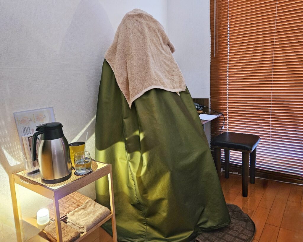 ちなみに、施術途中は香りが良くて飲みやすいよもぎ茶(国産&ノンカフェイン)やお水をごくごくいただきました。それもそのはず。よもぎ蒸しは、30~40分程度で消費カロリーは約750kcalにもなるよう。対して、一般的に、60分のサウナ利用でも消費カロリーはおよそ150kcal。よもぎ蒸しのカロリー消費率が、いかにスゴいかわかる数値です。