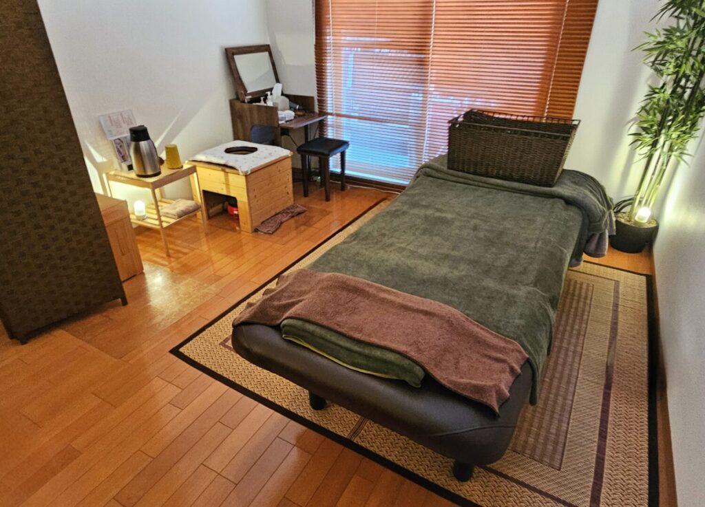 ゆったりしたプライベート空間のなか、国産のよもぎ蒸しや松山さんの細やかな気配りが感じられる施術で、身体も心も癒される至福のひととき。