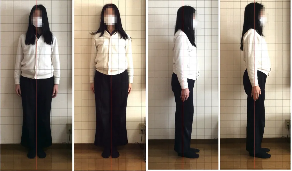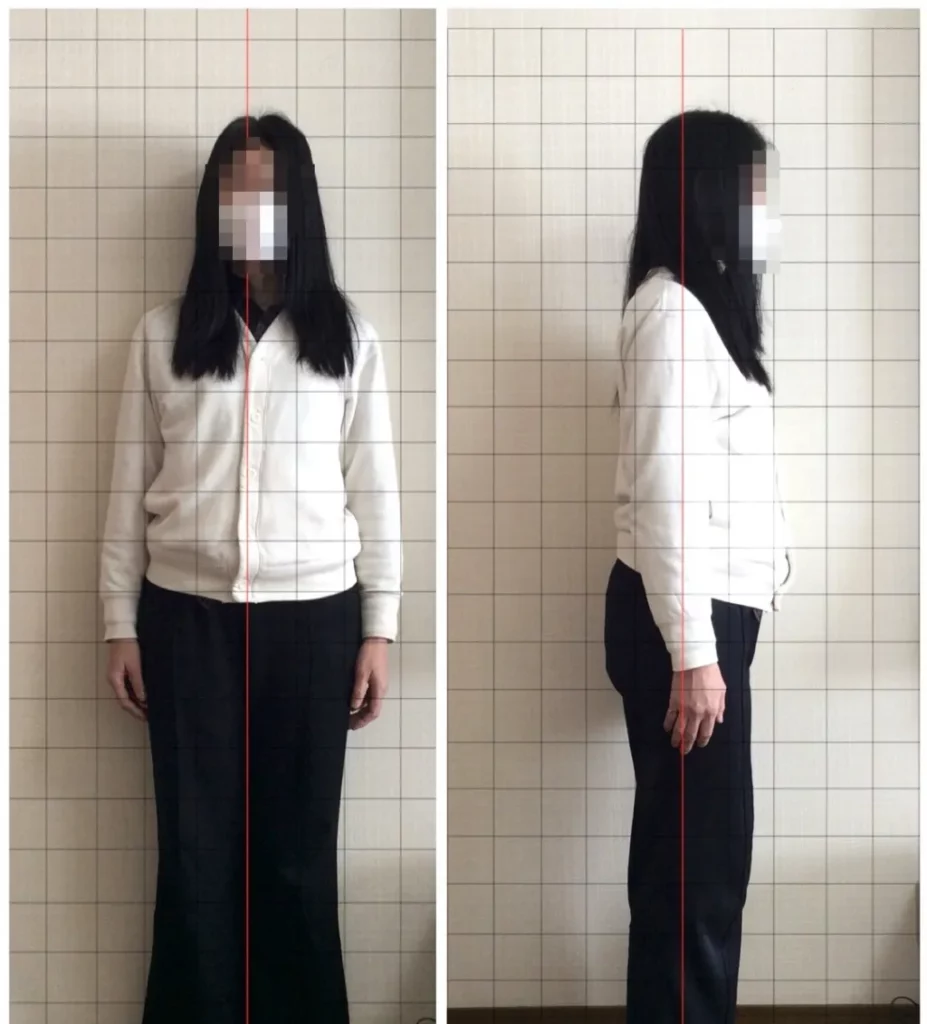 実際に姿勢の写真を撮ると、自分では真っ直ぐ立っているつもりなのに左肩が下がり、首が前に出ているのが一目瞭然!