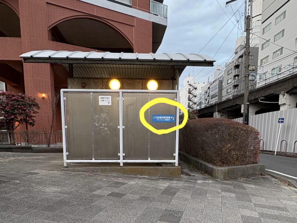 広場にあるものだと思っていたのですが見つからず迷っていたところ、広場右側の公衆トイレにこのような看板を見つけました。