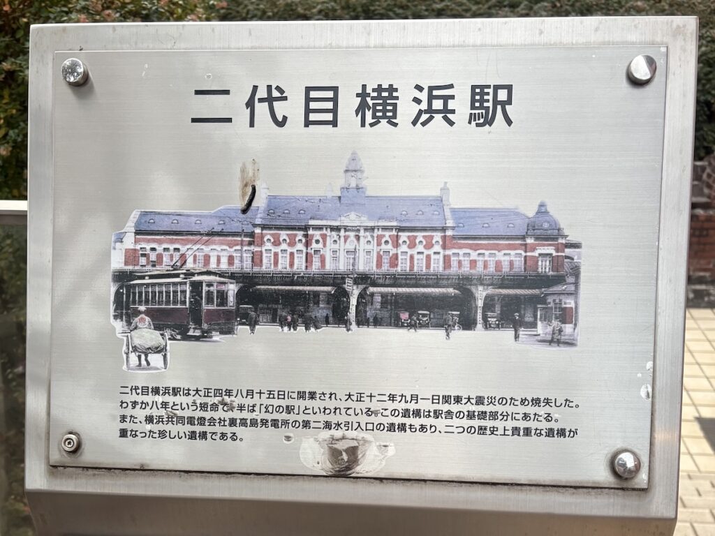 「二代目横浜駅遺構(マンション敷地内)」と書かれており、矢印があります。