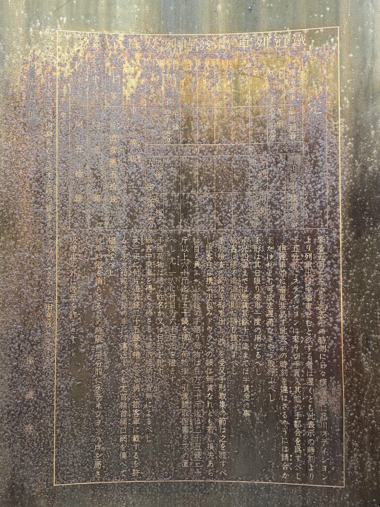記念碑の文字は少し読みにくいのですが、当時の運賃や時刻表なども書かれていました。
