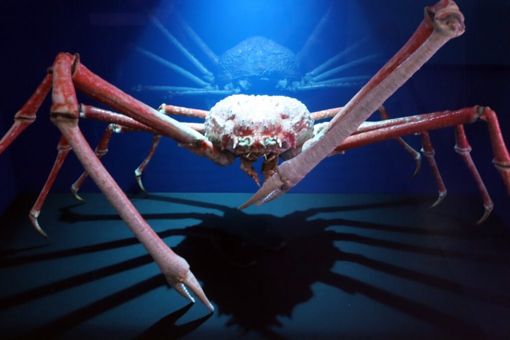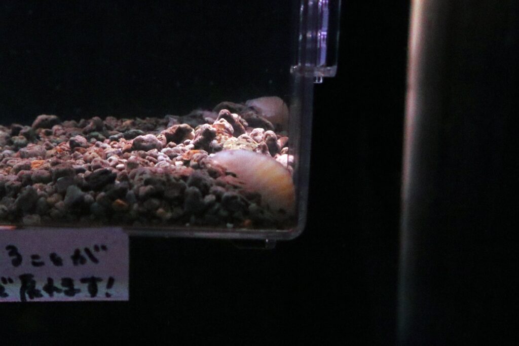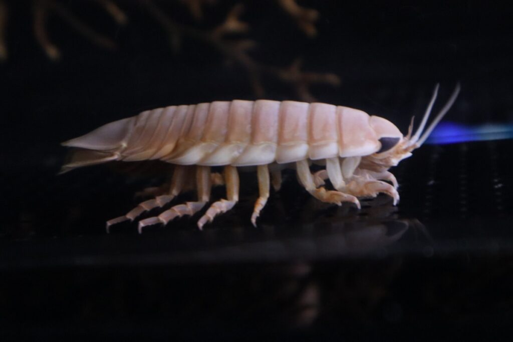 その他にも深海に生息する魚やサメ、エビなどの生き物も展示されています。個人的に気になった生き物は、初めて見たオオグソクムシの赤ちゃん(マンカ幼生)です。目元に特徴的な模様があり、小さな体ですがオオグソクムシらしさが伝わりました。