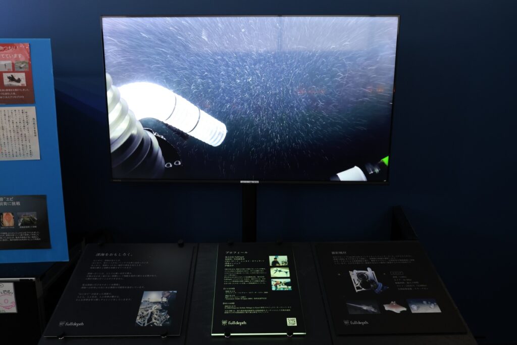 深海コーナーには、実際に水中ドローンで撮影された映像も公開されています。水中ドローンの開発者である株式会社FullDepthの「伊藤昌平」氏と共に、深海の様子や生き物の生態に迫るリアルで興味深い映像でした。