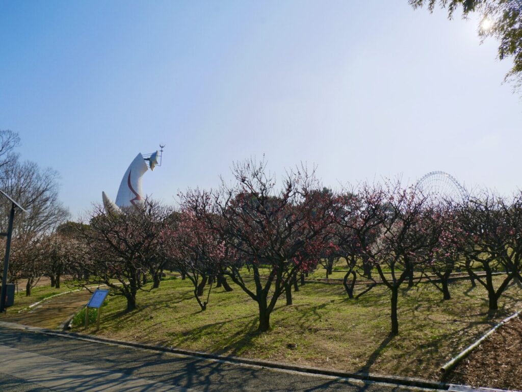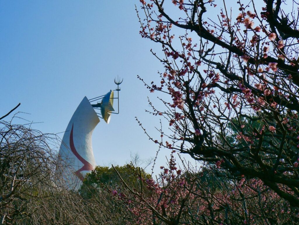 筆者おすすめの撮影スポットはこちらのアングル。梅林越しに万博記念公園のシンボル・太陽の塔が映えます。