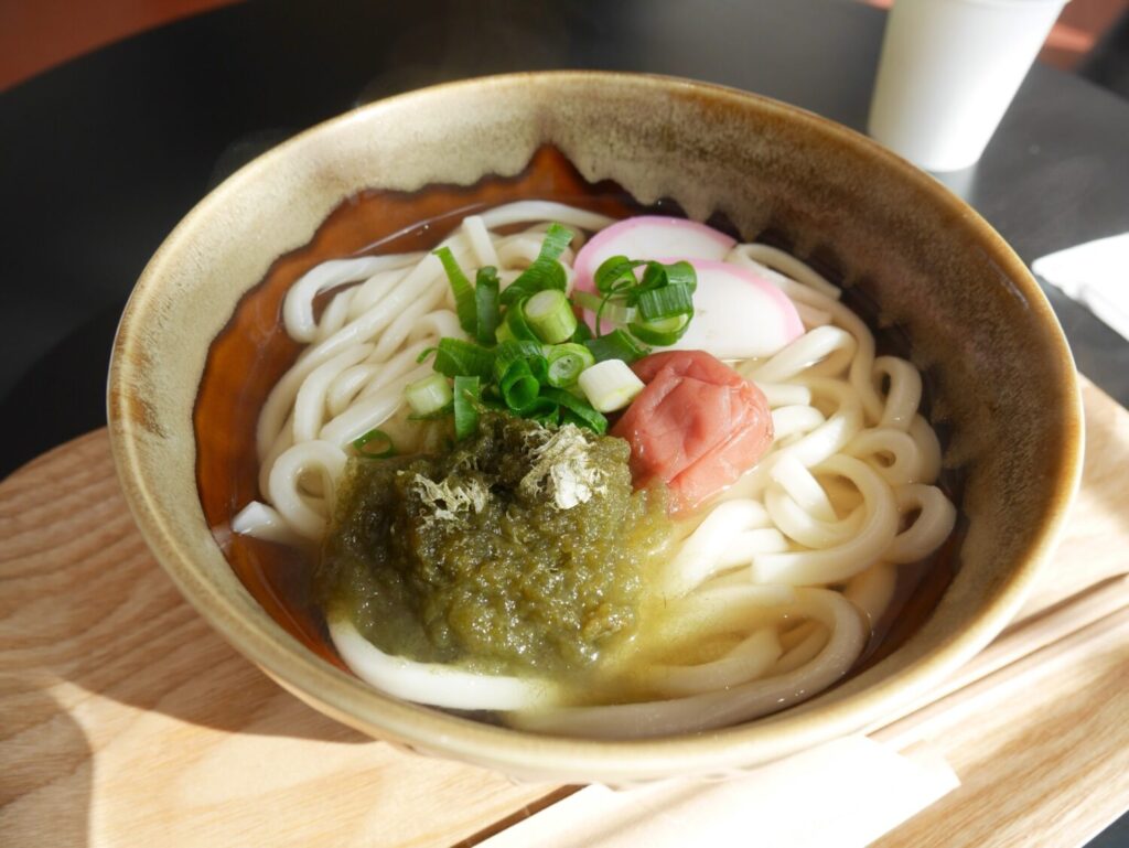 今回は、日本庭園内のレストラン「和み」で「紀州南高梅ととろろ昆布うどん」を注文してみました。南高梅の柔らかい果肉と出汁のうまみ、とろろ昆布のハーモニーが絶妙で、寒い時期にほっとできる美味しさでした。