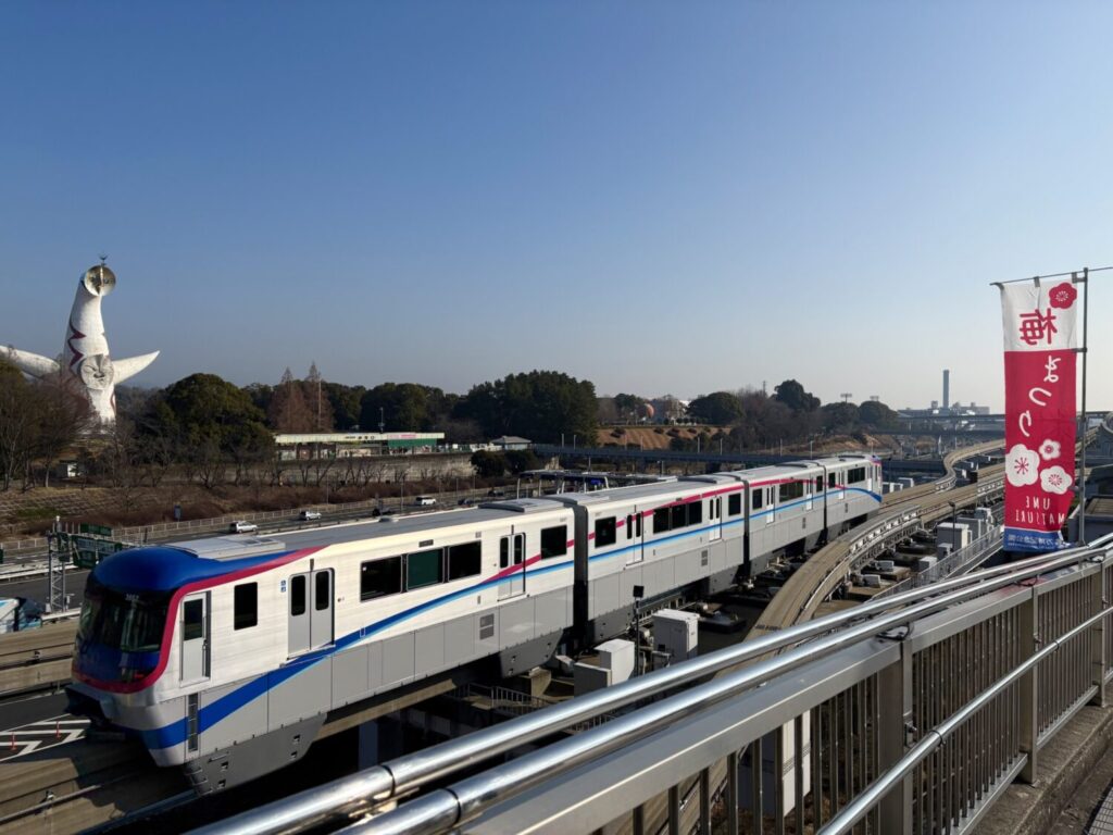 大阪モノレール「万博記念公園駅」を出ると、さっそく「梅まつり」ののぼりを発見。左奥には太陽の塔も見え、心弾みます。