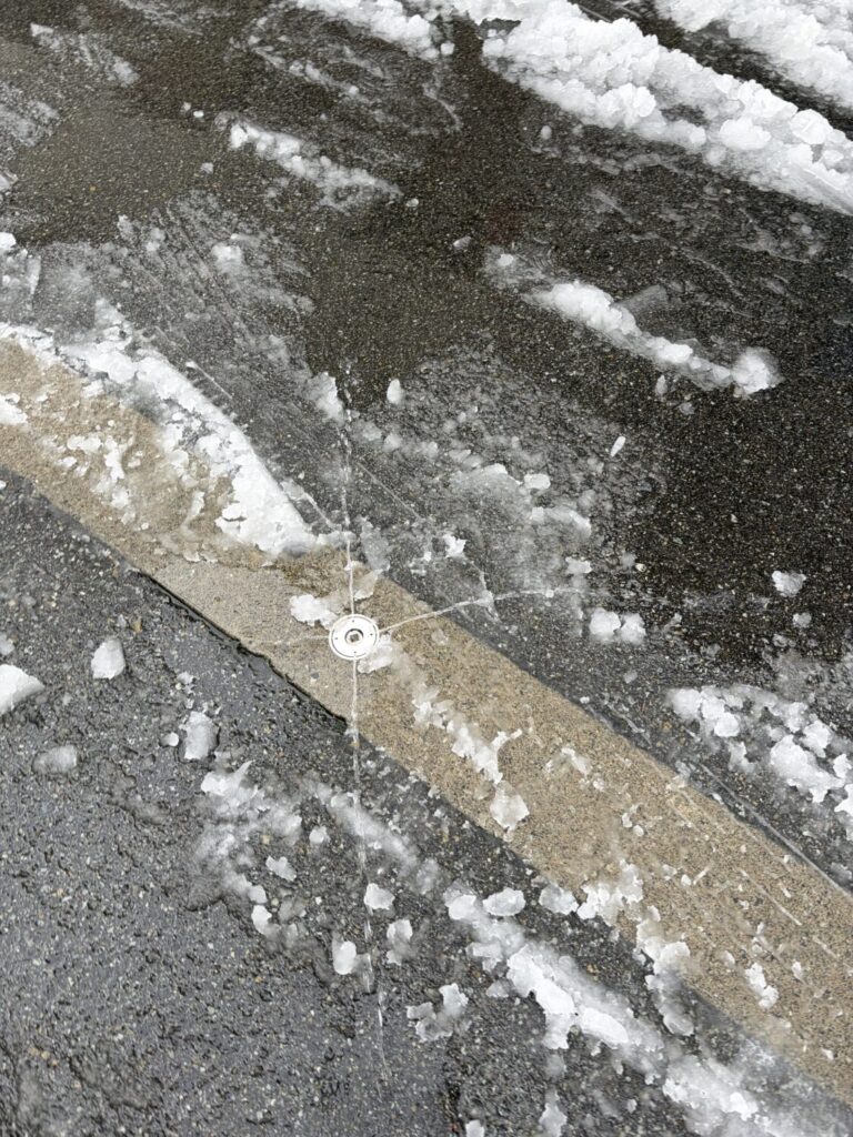 この日も雪が降って辺りは銀世界です。道路のスプリンクラーから水が出ていました。普段からこうやって雪を溶かしているのでしょうね。
