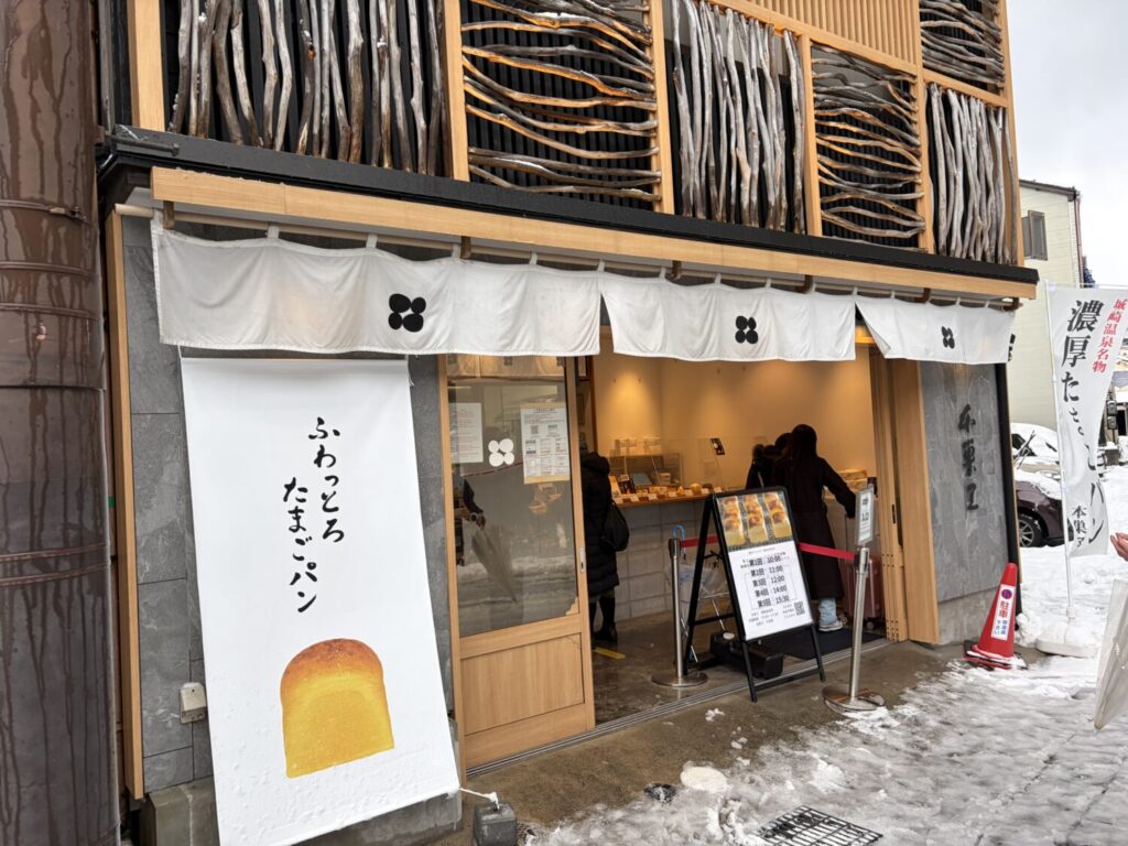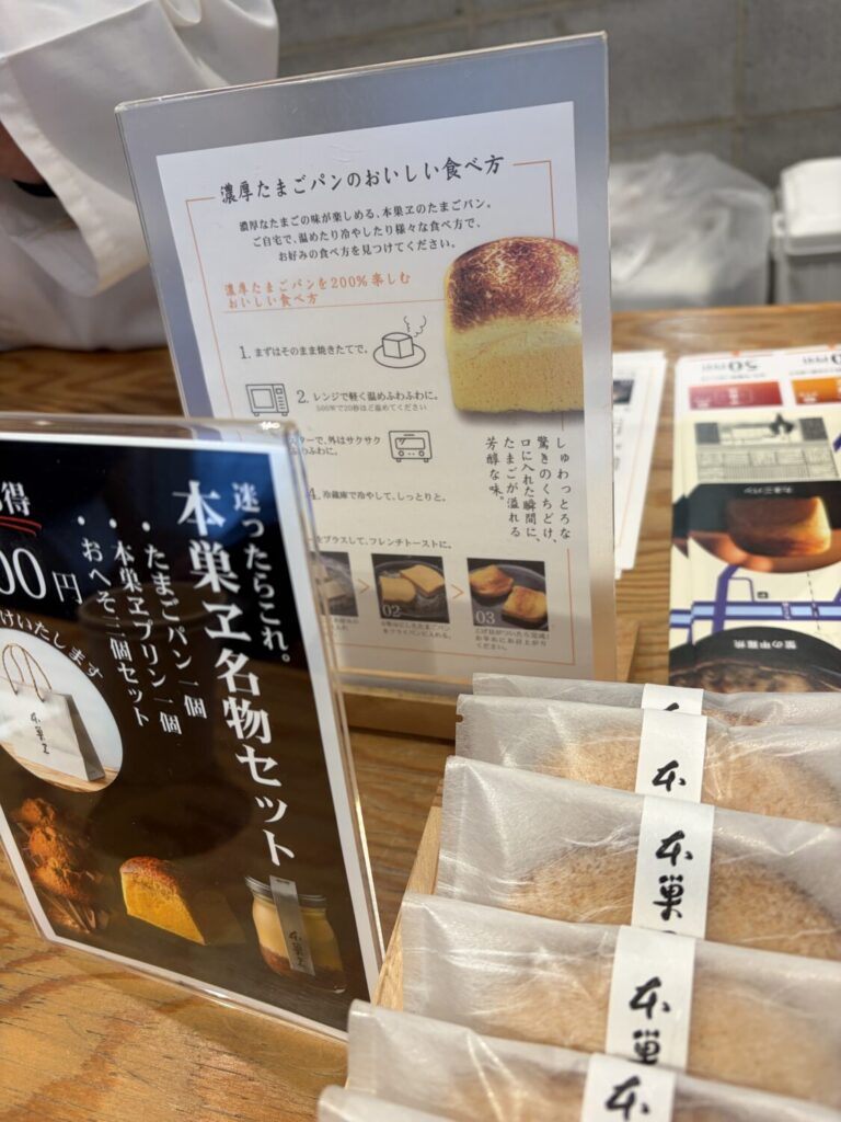 こちらは「たまご専門 本巣ヱ」です。濃厚たまごパンで有名になったお店で、この日も濃厚たまごパン目当てのお客さんがちらほら。こちらのお店、予約ができますので、確実に手に入れたい人は予約必須ですね。また、出来上がり時間も決まっていて、店内で食べることもできます。